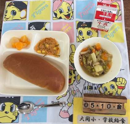 豚肉と野菜のカレースープ煮、変わりピザ、ミックスフルーツ(缶)、こくとうパン、牛乳です。