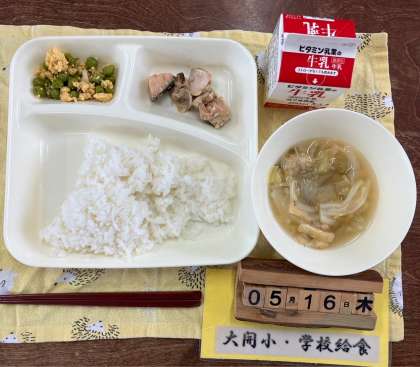 さけのごまみそ焼き、五目汁、えんどうの卵とじ、ご飯、牛乳です。