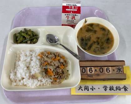 豚ひき肉とにらのそぼろ丼、じゃがいものみそ汁、さんどまめのごまあえ、牛乳です。