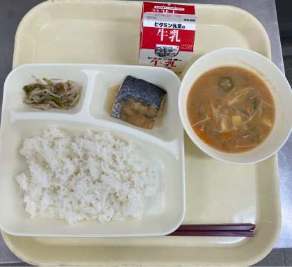 さごしのおろしじょうゆかけ、みそ汁、野菜いため、ご飯、牛乳です。