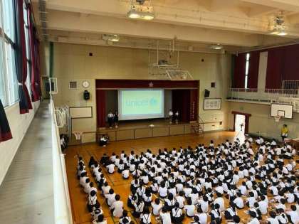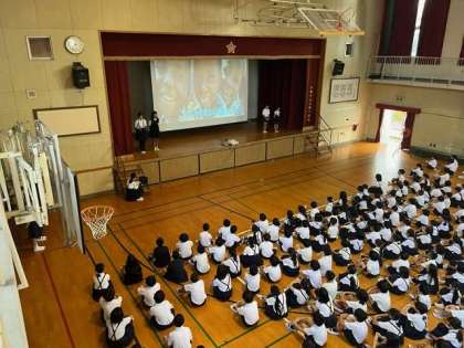 来週から募金週間が始まります。児童会が中心となって、児童集会で募金についてのプレゼンテーションを行いました。