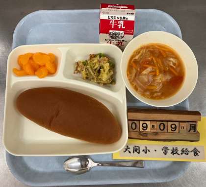 カレーマカロニグラタン、トマトスープ、みかん(缶づめ)、こくとうパン、牛乳です。