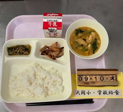 鶏肉の照り焼き、かぼちゃのみそ汁、なすのそぼろいため、ご飯、牛乳です。
