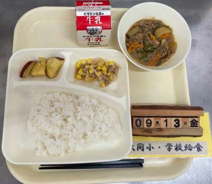 マーボーなす、ツナと野菜のいためもの、焼きさつまいもの甘みつかけ、ご飯、牛乳です。