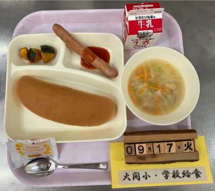 ウインナーのケチャップソース、スープ、焼きかぼちゃ、コッペパン、牛乳です。
