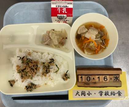 鶏肉のゆず塩焼き、ソーキ汁、ツナ大豆そぼろ、ご飯、牛乳です。