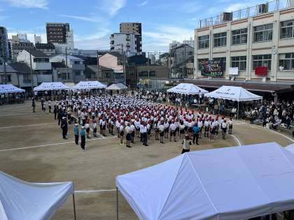 運動会を開催しています。雨の心配もありましたが、青空の中児童は元気に行進しました。