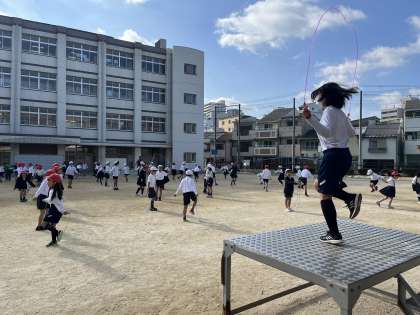 今日運動だいすき週間で、かけ足跳びを練習しました。運動委員会の児童の見本を見ながら、挑戦しました。