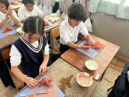 テラコッタ粘土を使ってシーサーを作りました。体の部品が取れないようによく練ってからくっつけていました。