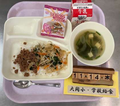 ビビンバ、わかめスープ、いもけんぴフィッシュ、ご飯、牛乳です。