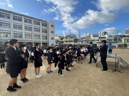 児童朝会で、全校遠足の表彰を行いました。どのにこにこ班も力を合わせて問題を解いていましたね。上位3班が表彰されました。