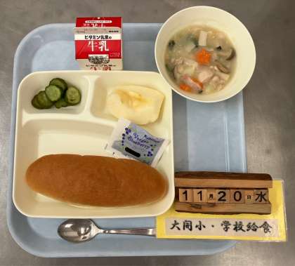 鶏肉ときのこのシチュー、きゅうりのピクルス、りんご、ブルーベリージャム、コッペパン、牛乳です。