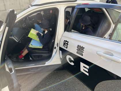 社会見学で福島警察署へいきました。パトカーや青バイに乗せてもらい、たくさん質問しました。