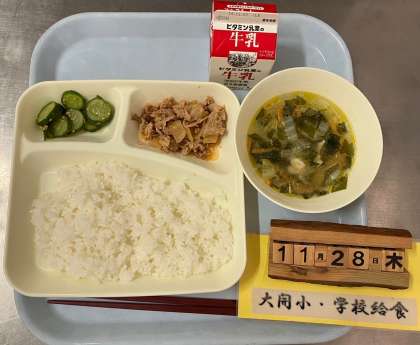 豚肉のコチジャンいため、鶏肉とはるさめのスープ、きゅうりのナムル、ご飯、牛乳です。