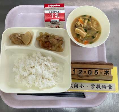 鶏肉の甘辛焼き、みそ汁、だいこんの煮もの、ご飯、牛乳です。