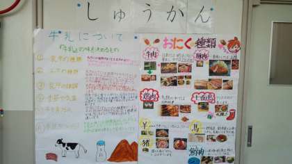 1月18日〜22日は、給食週間でした。給食委員会のみんなが中心になって、様々な食べ物について調べました。その結果を模造紙に何枚もまとめて職員室前に掲示しています。