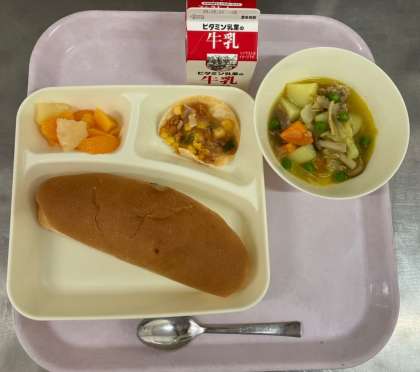 豚肉と野菜のカレースープ煮、変わりピザ、ミックスフルーツ(缶)、レーズンパン、牛乳です。