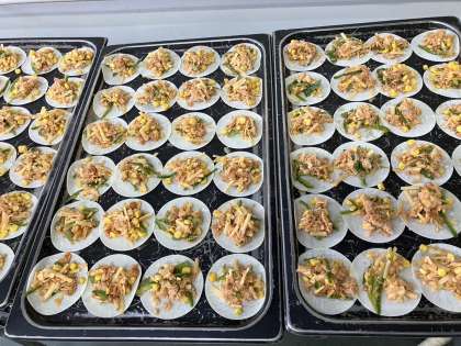 変わりピザは、ぎょうざの皮に新商品の「乳なしチーズ」とツナ、コーン、ピーマン、ピザソースを混ぜ合わせた具をのせ、焼き物機で焼いています。乳なしチーズは、乳製品が含まれていないので、乳アレルギーがある人も食べることができます。