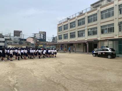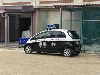 今朝の全校朝会では、青パトの方々に来ていただきました。いつも朝や下校の時間帯に青パトに乗って地域巡回をしていただいてる話や、110番のお店の話、登下校中の注意点の話をしてくれました。