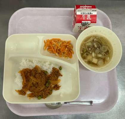 タコライス、とうふともずくのとろり汁、にんじんしりしり風、ご飯、牛乳です。