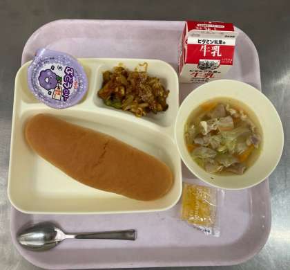 カレーマカロニグラタン、てぼ豆のスープ、ぶどうゼリー、コッペパン、マーマレード、牛乳です。