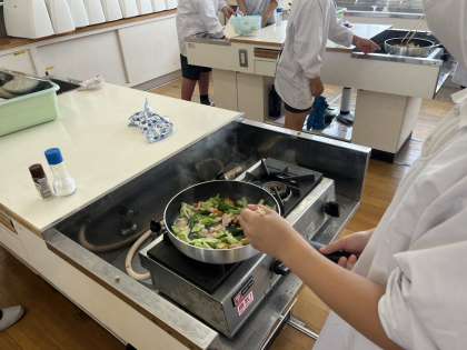 今日は6年生が家庭科室で調理実習を行いました。内容は野菜炒めで、包丁で丁寧に野菜を切った後、火加減に気をつけながら炒めて上手に作ることができました。