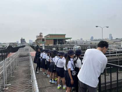 社会見学 川から汲み上げた水が、だんだんときれいになっていく様子を見せてもらっています。