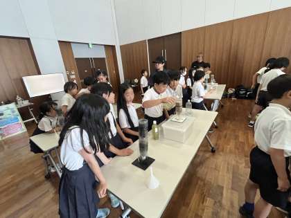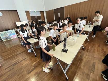 部屋の中で、先ほど学んだ方法を思い出しながら淀川の水を飲める水にするための実験をしています。