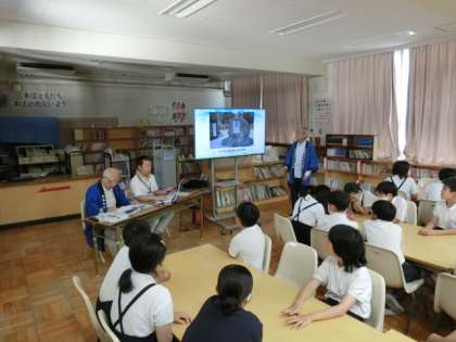 2時間目に図書室にて、福島区役所の方と、福島区未来わが町会議のみなさんに来ていただきました。福島区・大開の歴史について、クイズ形式を織り交ぜながら説明していただきました。