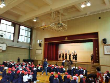 今日の児童集会は、言葉当てクイズでした。画用紙に書かれたいくつかの文字を、集会委員会の人たちがが舞台のまわりをヒラヒラさせながら動き回ります。