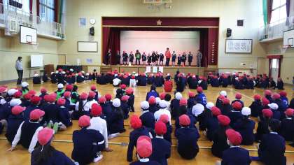 今日の集会は、何人できるか当てようゲームでした。集会委員の児童がけん玉をして何人できたかや、カップを10個積めるのは何人でしょうなど、楽しい内容のデームでした。みんなもとても楽しく活動できました。