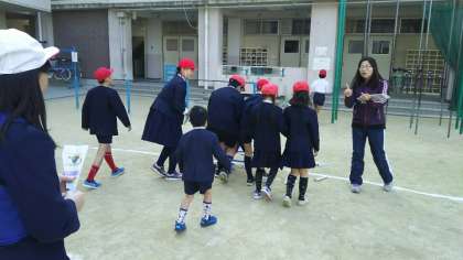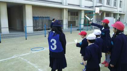 内容は、すこし離れたところにあるフープの中に紙飛行機を投げて入れるグループ活動でした。うまいこと紙飛行機が飛んでくれず苦戦してましたが、みんながみんな楽しそうでした。