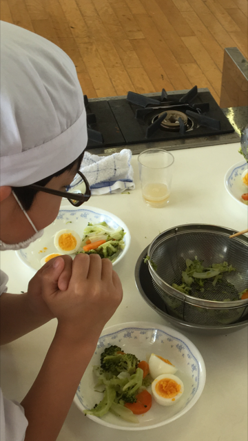 5月16日.17日に調理実習でサラダ作りをしました。野菜を切ったり、卵を茹でたりする作業を友だちと協力して行うことができました。自分たちで作ったサラダはとても美味しかったです。