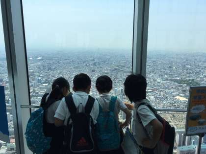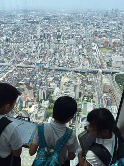 60階の展望台からの景色は圧巻!「大阪市は緑が少ないなぁ。」「あそこはビルばっかり!」と口々に言いながら、すばらしい景色に見入っていました。