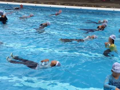 服を着て靴をはいて水に入ると思うように動けませんでした。初めは苦労していましたが、ペットボトル1本で「すごい浮ける!」と驚きの声をあげながら、みんな真剣に学習をしました。