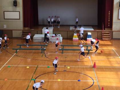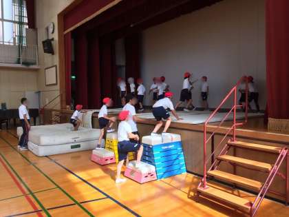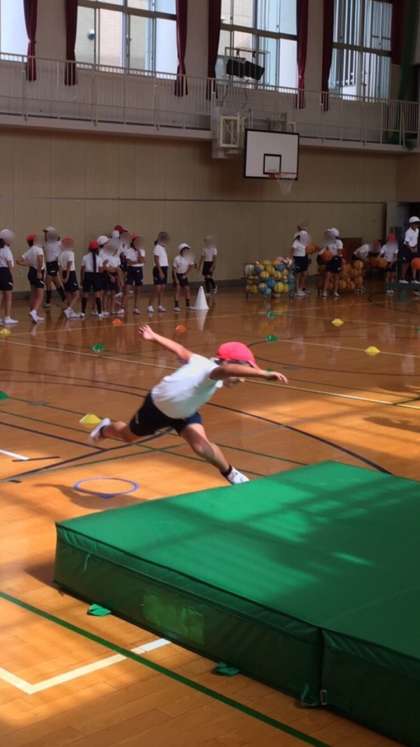 「様々な動きに挑戦しよう!」ということで、舞台に前転で登る場・平均台の場・マーカータッチの場・台上前転の場