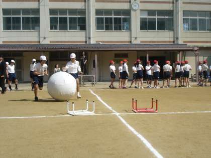 今日の体育朝会は全校競技の大玉送りの練習をしました。
