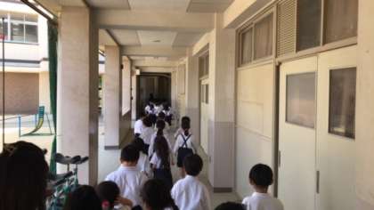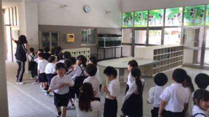 一年生が、学校探検で校舎の見学をしました。校舎が広くて大変です。