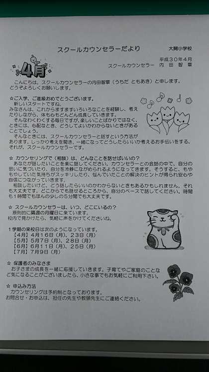 今年度もスクールカウンセラーが定期的に在校し、皆さんからの相談を受け付けております。