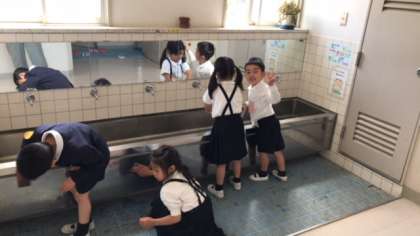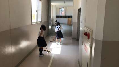 1年生も少し学校に慣れてきました。お昼の清掃活動です。学校をきれいにお掃除をしています。