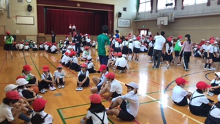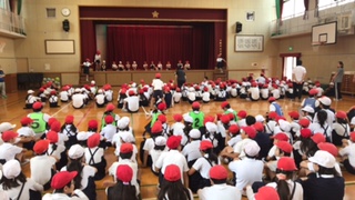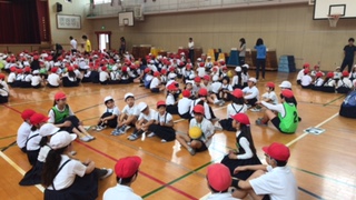 児童朝会で全校児童で「ゴロピカドン」ゲームをしました。縦割りで全校児童が取り組み、歓声と拍手が起こっていました。