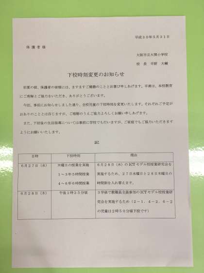 6月下校時刻変更のお知らせ