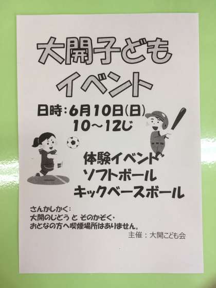 大開こども会主催の体験イベントが6月10日日曜日にあります。よろしくお願いします。