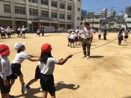 本日より1週間、休み時間に長縄習慣を実施します。各学級ごとに、運動場にでて、長縄で「全員とび」や「8の字とび」を行います。友だち同士で縄に入るタイミングを教え合う微笑ましい姿がみられました。子どもたちの体力と技術の向上、そして進んで運動しようとする態度を育むことを目標としています。暑い季節となりますが、これからも元気に運動場で運動したり、遊んだりする子どもたちが増えていってほしいと思います。