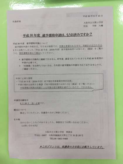 平成30年度 就学援助制度のプリントを配布させていただきました。申請締め切りが6月30日金曜日までとなっておりますので、ご確認よろしくお願い致します!