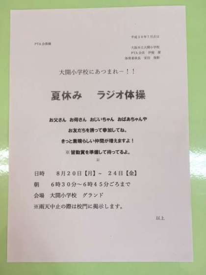 プリントを配布させていただきました。ご確認ください。8/20〜24実施の夏休みのラジオ体操出席カードもございます!