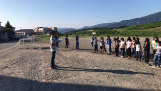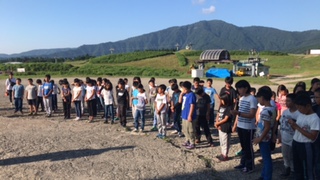 朝のつどいを広場で行いました。全員元気に林間学習の最終日を迎えました。