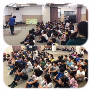 多目的室で、タコ作りの説明を聞いています。説明をしっかりと聞いて空高く飛ぶタコを作ります。