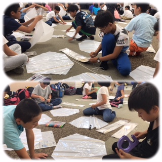 友達と協力し合いタコの骨組みを作っています。 iPhoneから送信