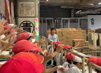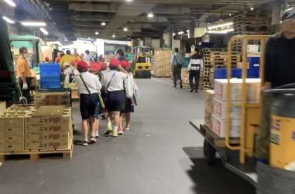 今日は、3年生児童が大阪市中央卸売市場へ社会見学に行きました。本場の中では、全国各地から運ばれてきた野菜や果物、お魚がたくさん並んでいました。こどもたちは、競りにかけられる品物の量多さと市場の広さに驚いていました!せり人の方に、手振りの数の表し方を教えてもらい、たくさんお土産をもらって帰りました。とても熱心をお話を聞いて、メモを取っている姿が印象的でした!